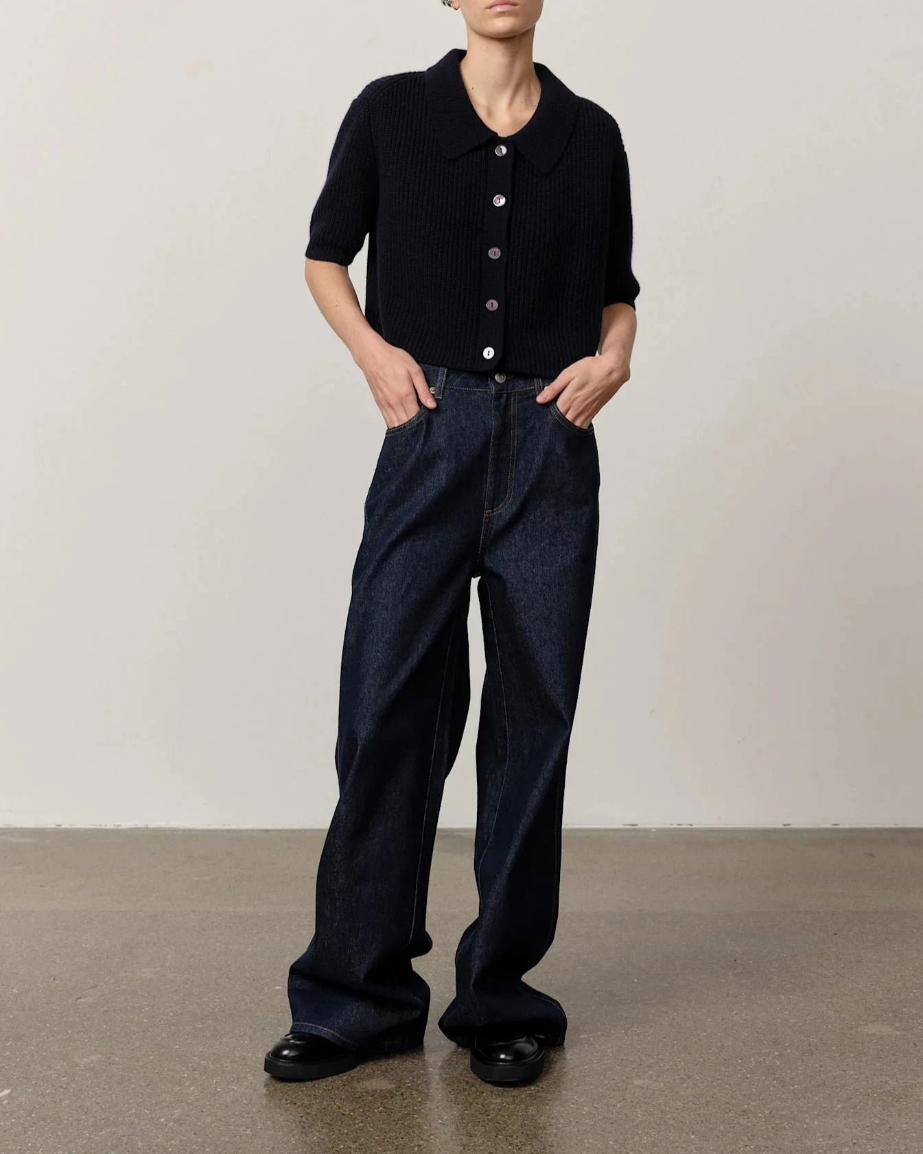 ntroducing the Aria Knit Cardigan: A slightly cropped knit cardigan with mid-length sleeves and a relaxed fit, featuring a five-button closure and ribbed texture.