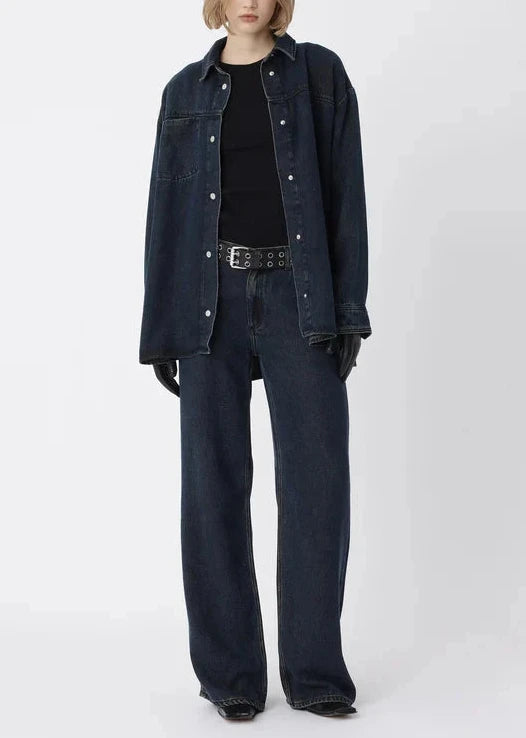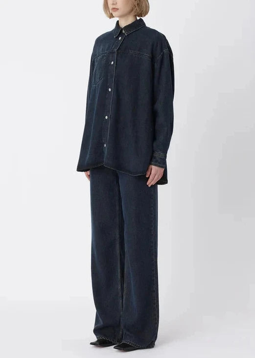 Oversize shirt with a high slit at back and a special front pocket. Created in our drapy denim in a dark blue wash.