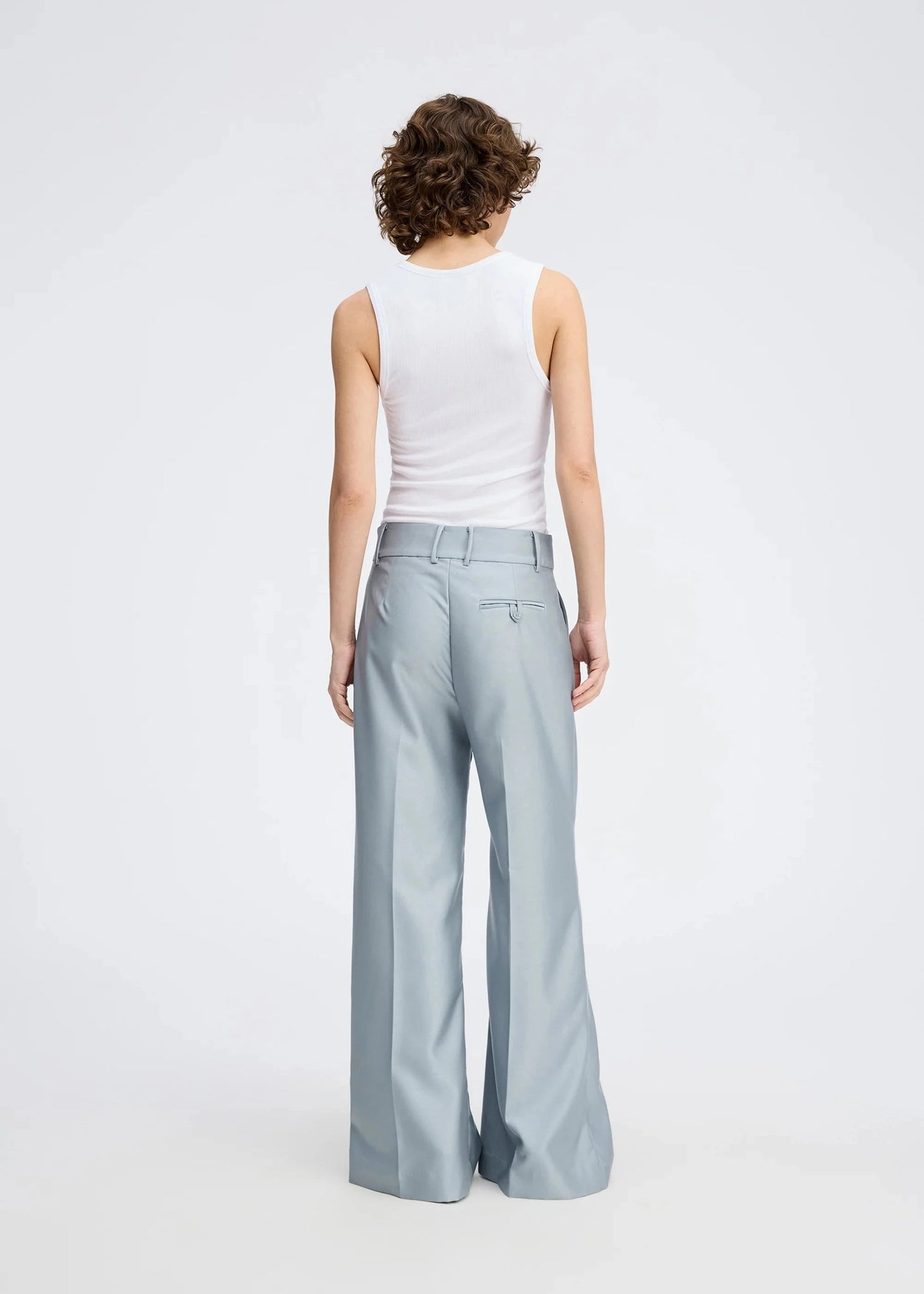Elegant trousers with wide legs and fine pressed pleats. These trousers are designed with belt loops, pockets, and a beautiful button fastening at the waist. They can be styled with the Rillo Jacket for a complete and stylish suit.