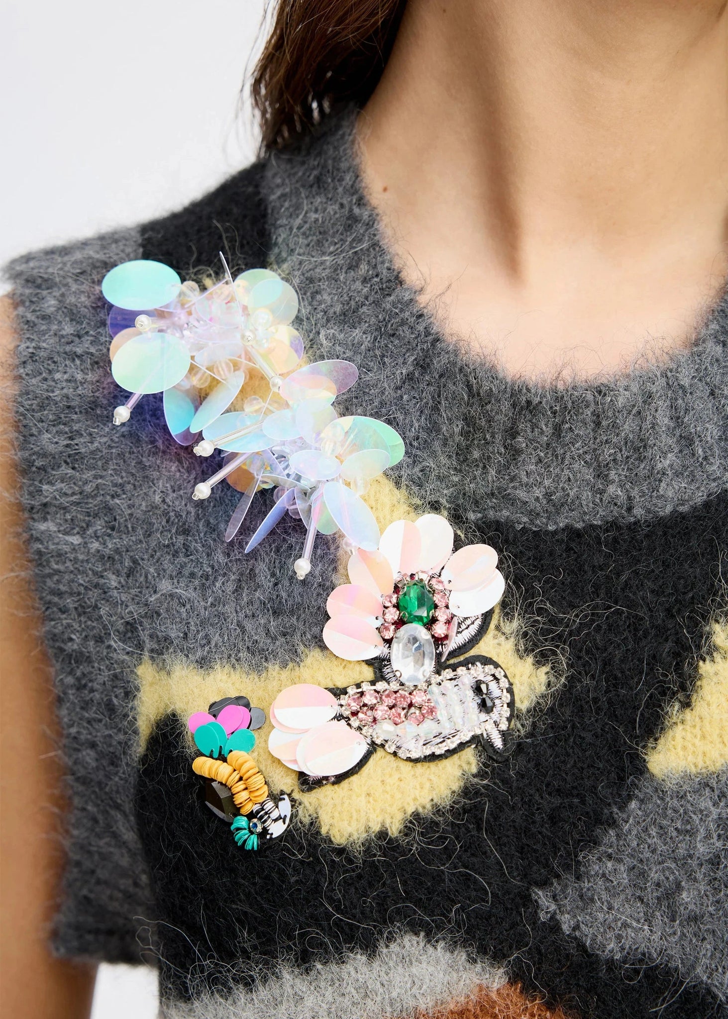 Beautiful, soft knitted vest with an elegant, abstract pattern in grey, yellow, and earthy tones. The vest is adorned with sparkling appliqués and floral details, creating a beautiful and artistic expression.