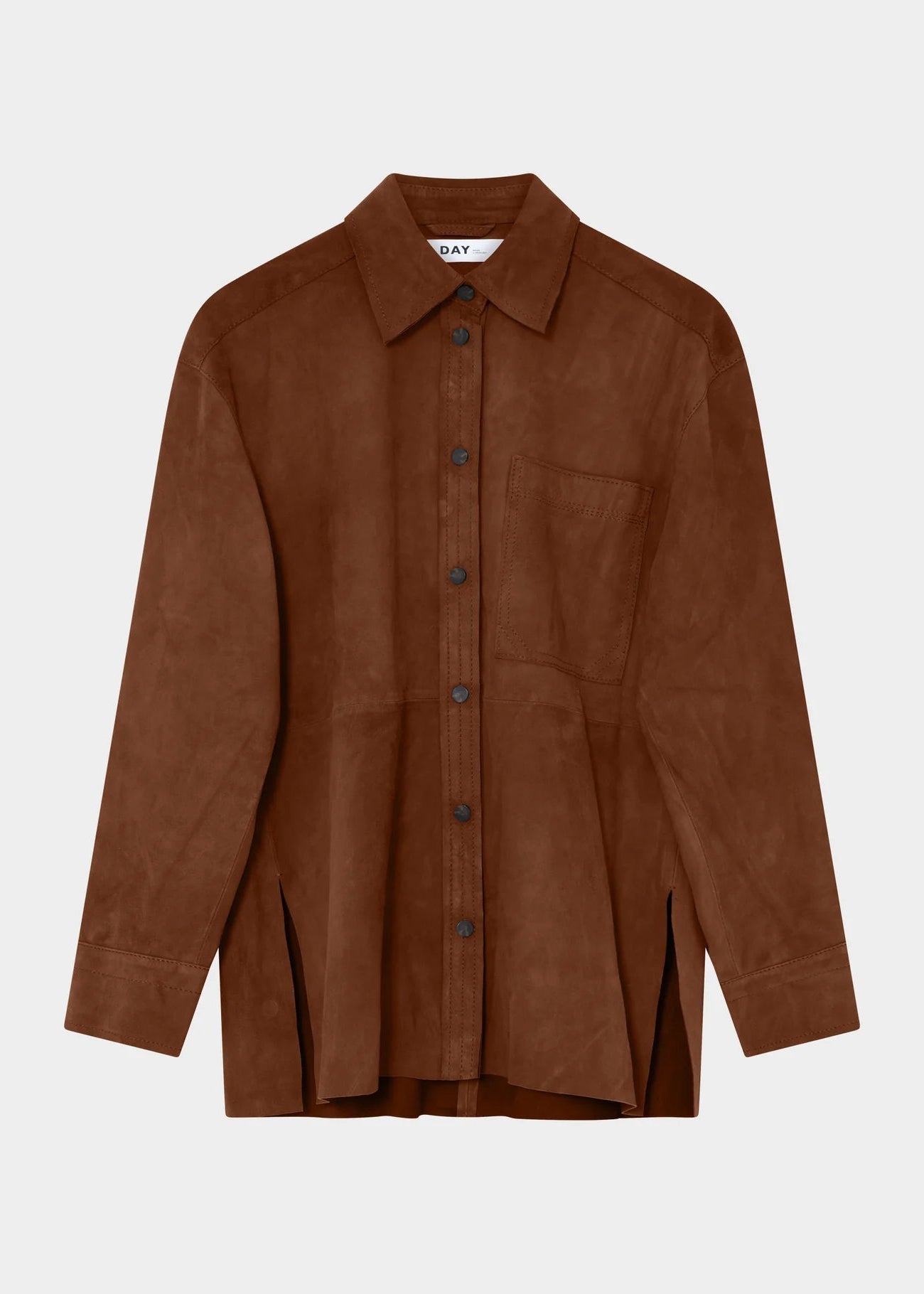 Made from the softest suede leather in a warm Caramel Café hue, the Andreas Jacketfrom Day Birger et Mikkelsen is a modern take on the classic overshirt. Lightweight and unlined for effortless layering, it features a sharp point collar, snap button closures, and a single chest pocket for a clean, utilitarian feel.
