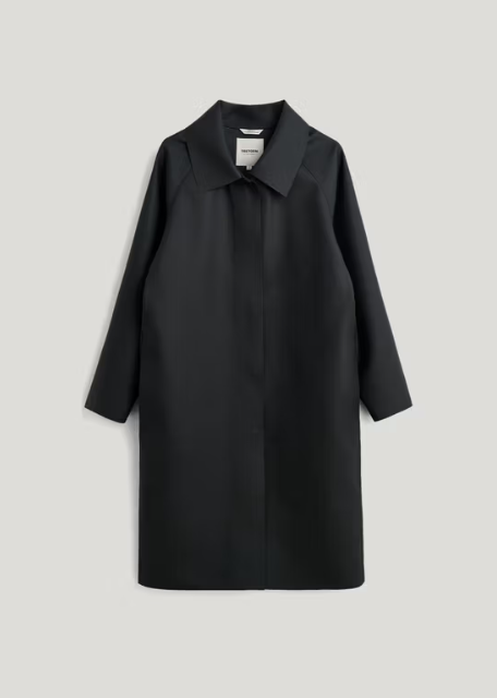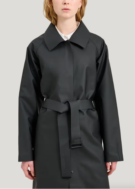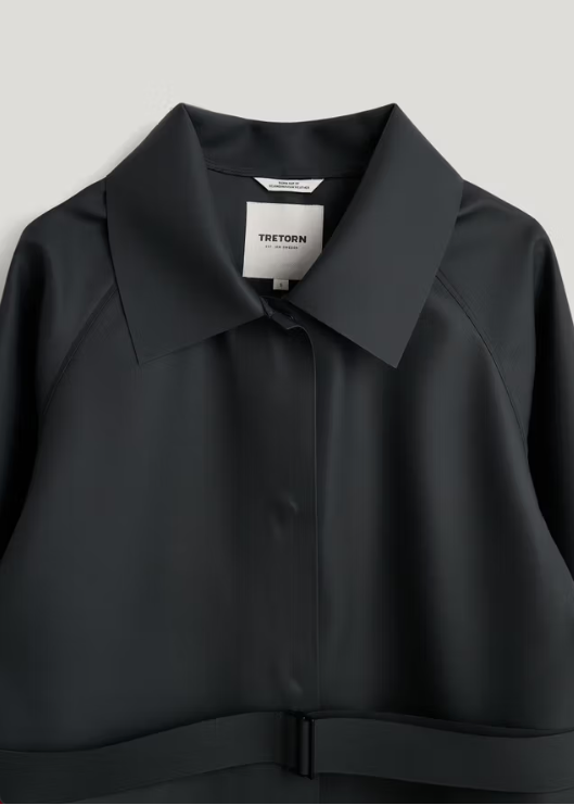 Raven Coat is a women's jacket with a clean and understated look, designed to work equally well in everyday wear as in more dressed-up situations. It has a naturally roomy fit with sharp lines and is made of a durable, waterproof material with a matte PU finish. The jacket is completely windproof and has welded seams that protect against rain and wind, while the canvas-like structure gives a modern and sophisticated look. Discreet pockets in the side seams with hidden metal snaps and an adjustable belt at the waist with a metal buckle provide function and fit adjustment without disturbing the silhouette.