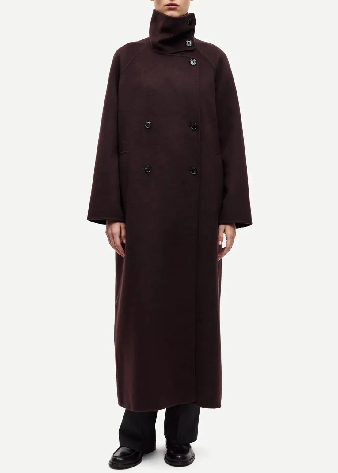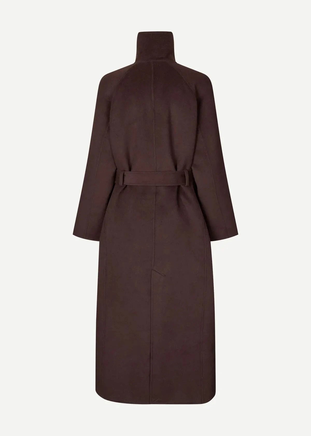 Felted coat with an oversized fit and rounded sleeves. Double-breasted button closure on the front and buttons at the high funnel neck. Welt pockets on the front. Detachable belt at the waist. Main material made from a blend including recycled wool.