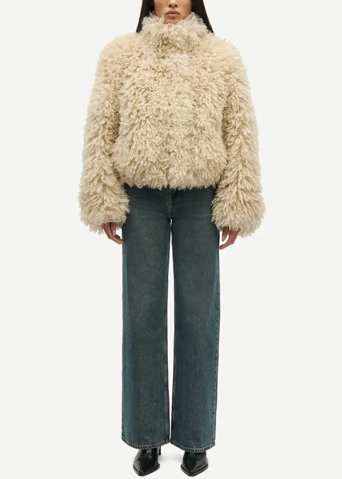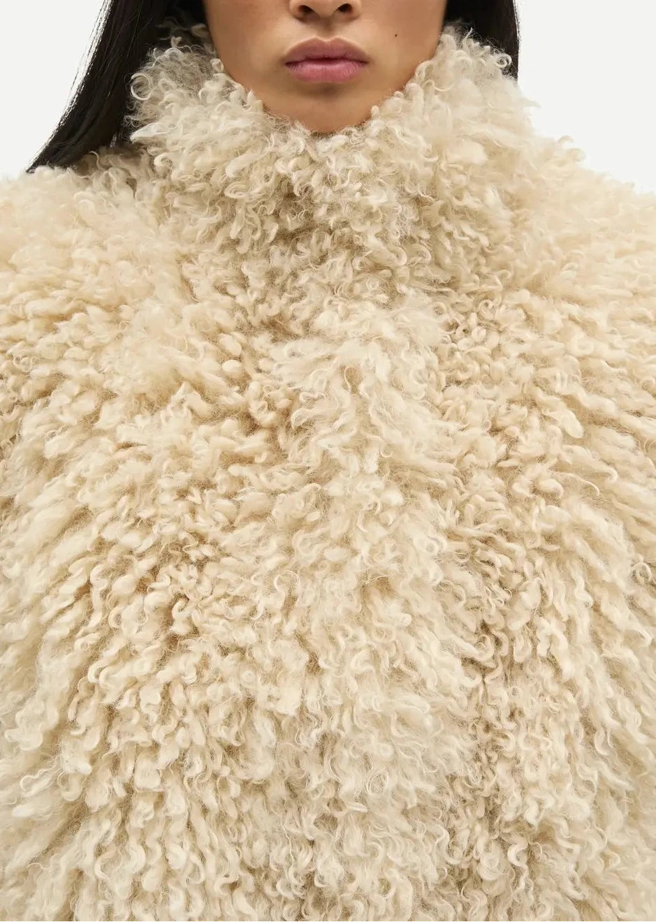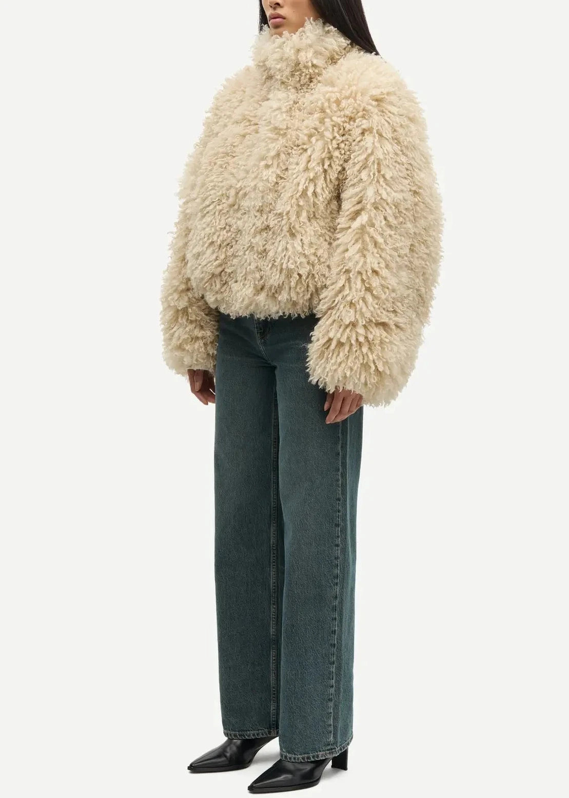 Faux fur jacket with an oversized fit. Hidden snap button and zipper closure on the front. Rib-knitted cuffs and elasticated hem. Side slit pockets on the front. Lightly padded. Fully lined. Main material made from 100% recycled polyester.