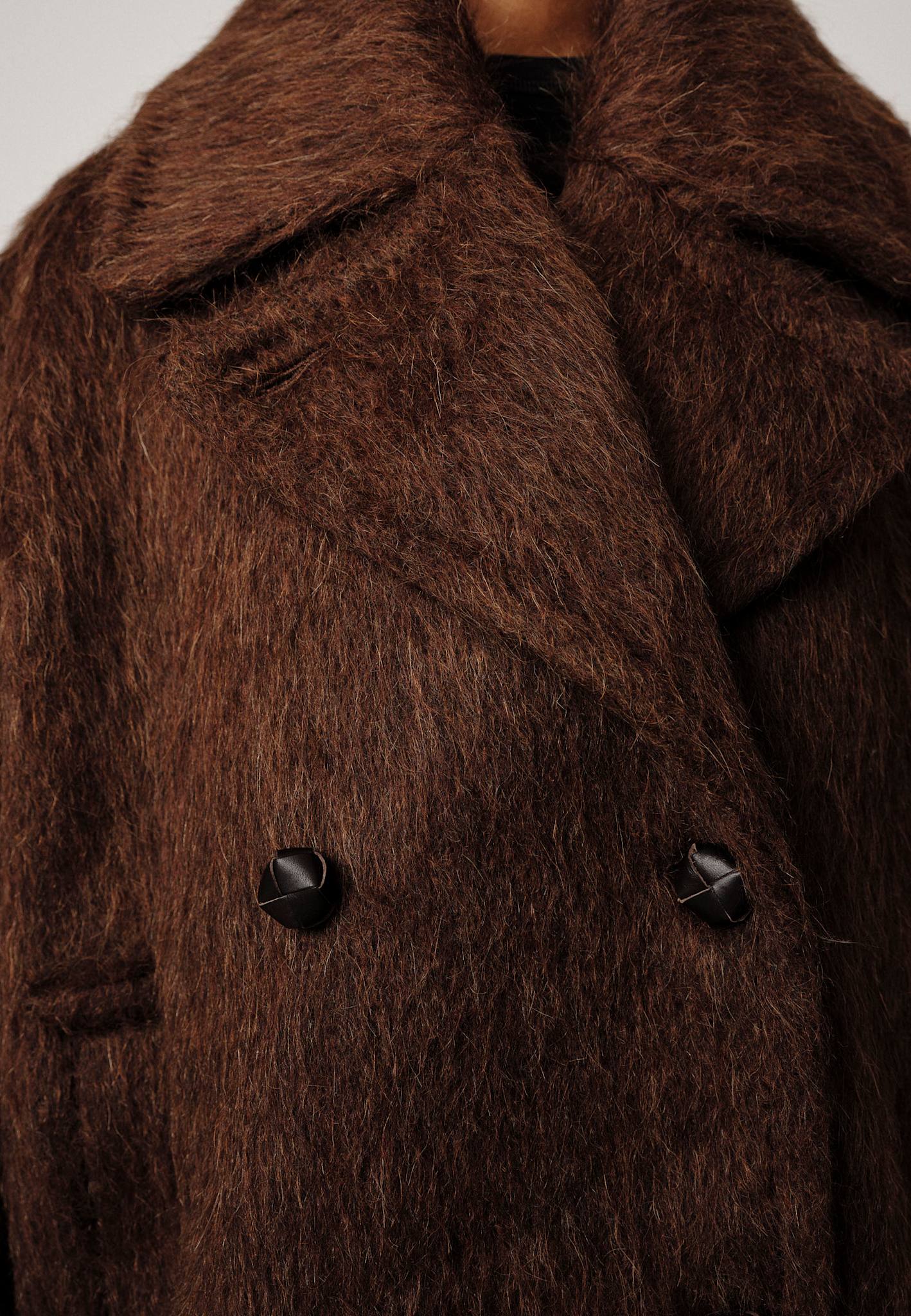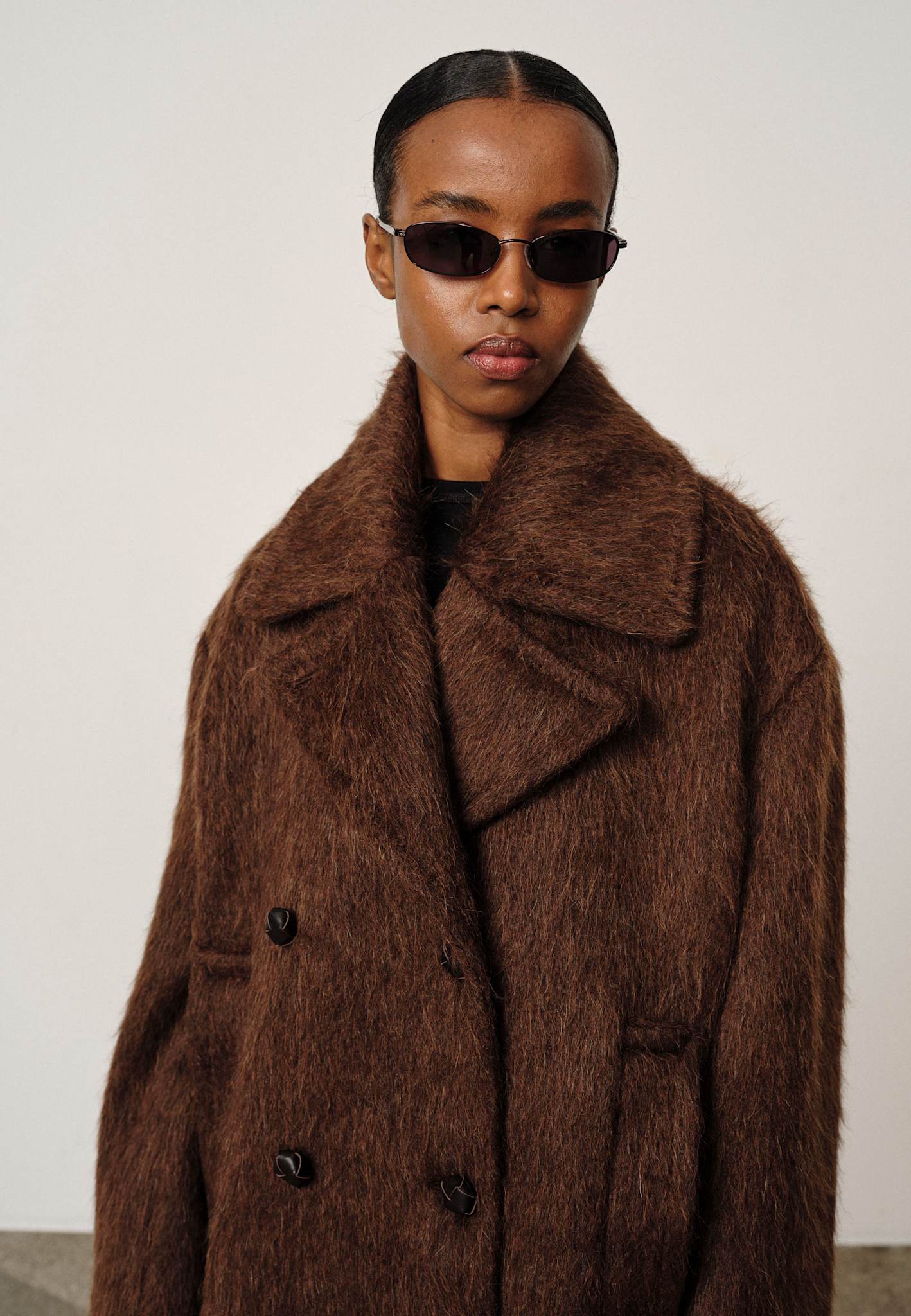 Introducing the Shelby Coat: A voluminous coat with draped shoulders and a large collar, featuring two slanted pockets and a button detail.