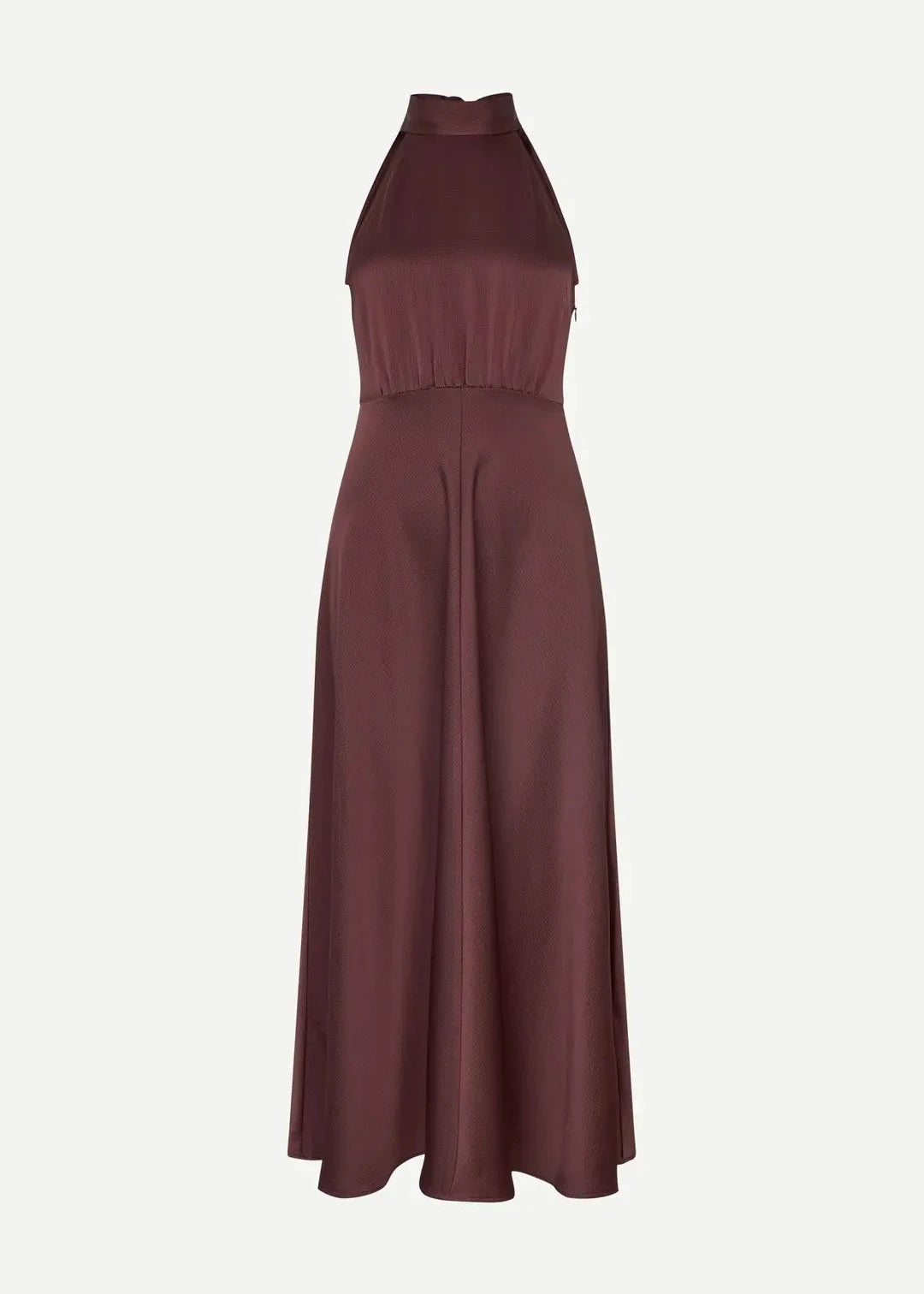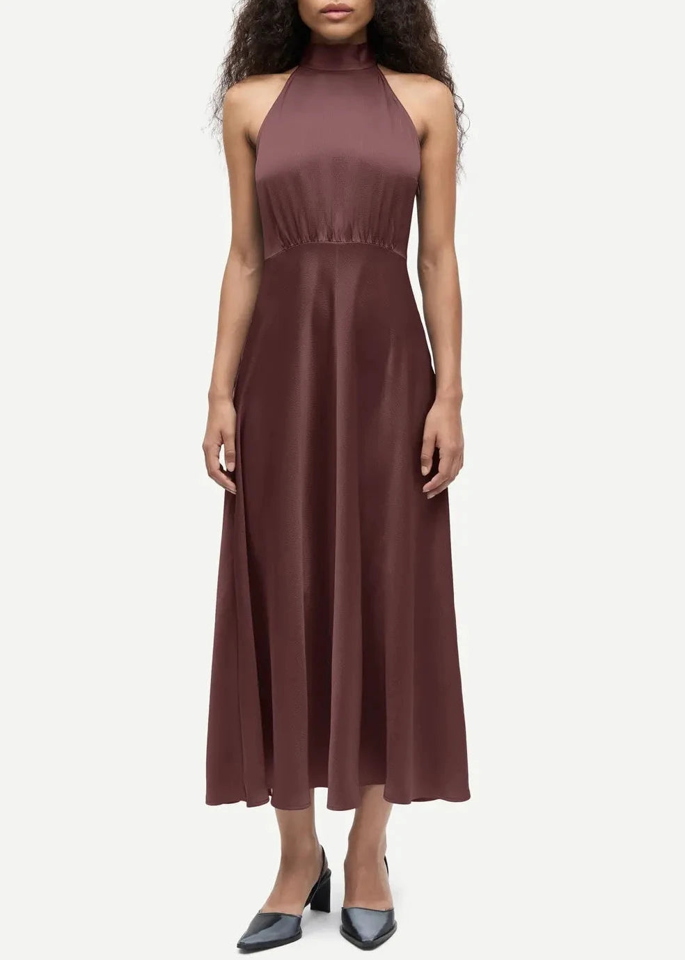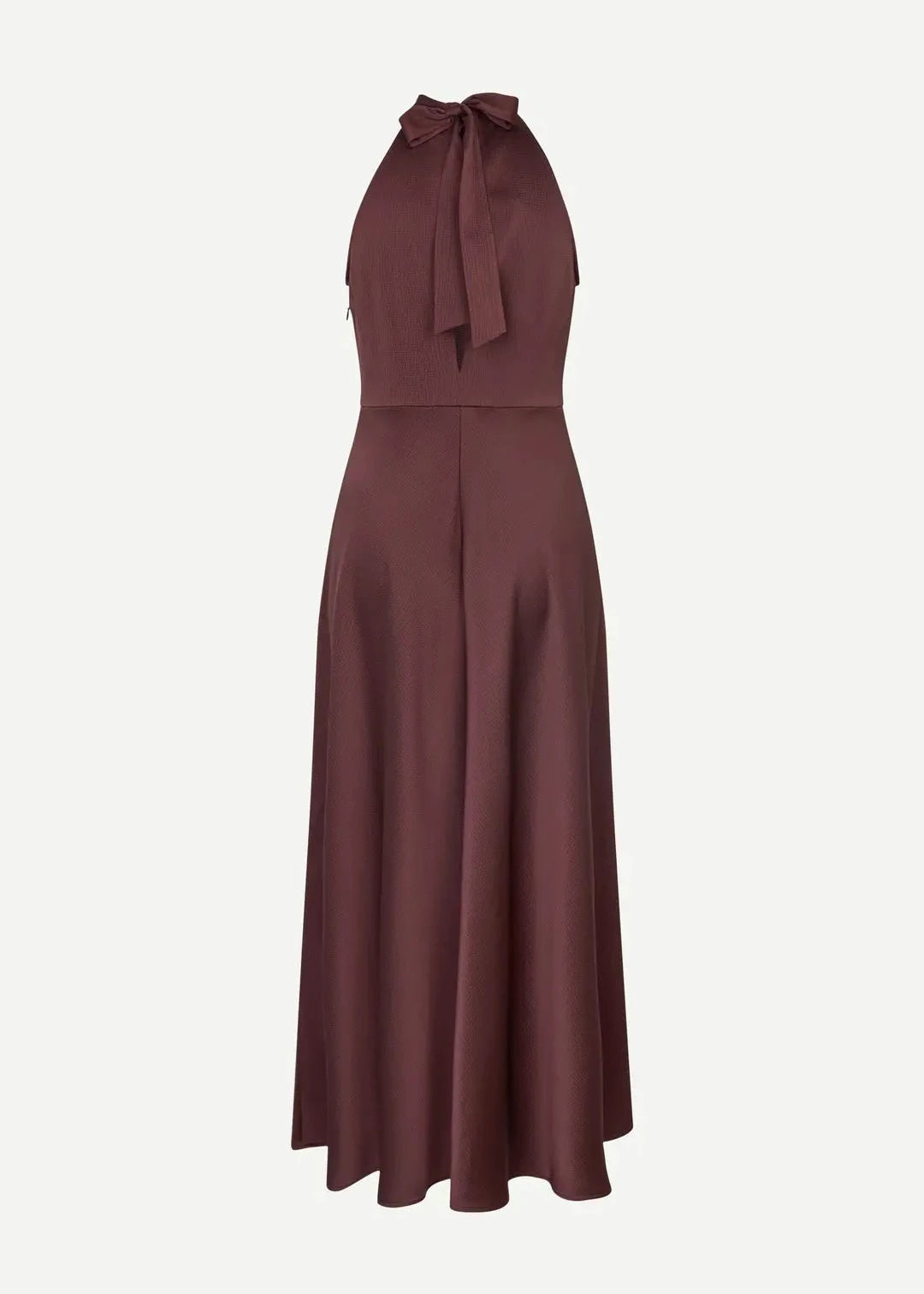 Sleeveless satin midi dress with a regular fit and flared skirt. Self-tie closure at the back and zipper closure on the side. Back split opening. Main material made from an elastic blend with recycled polyester.