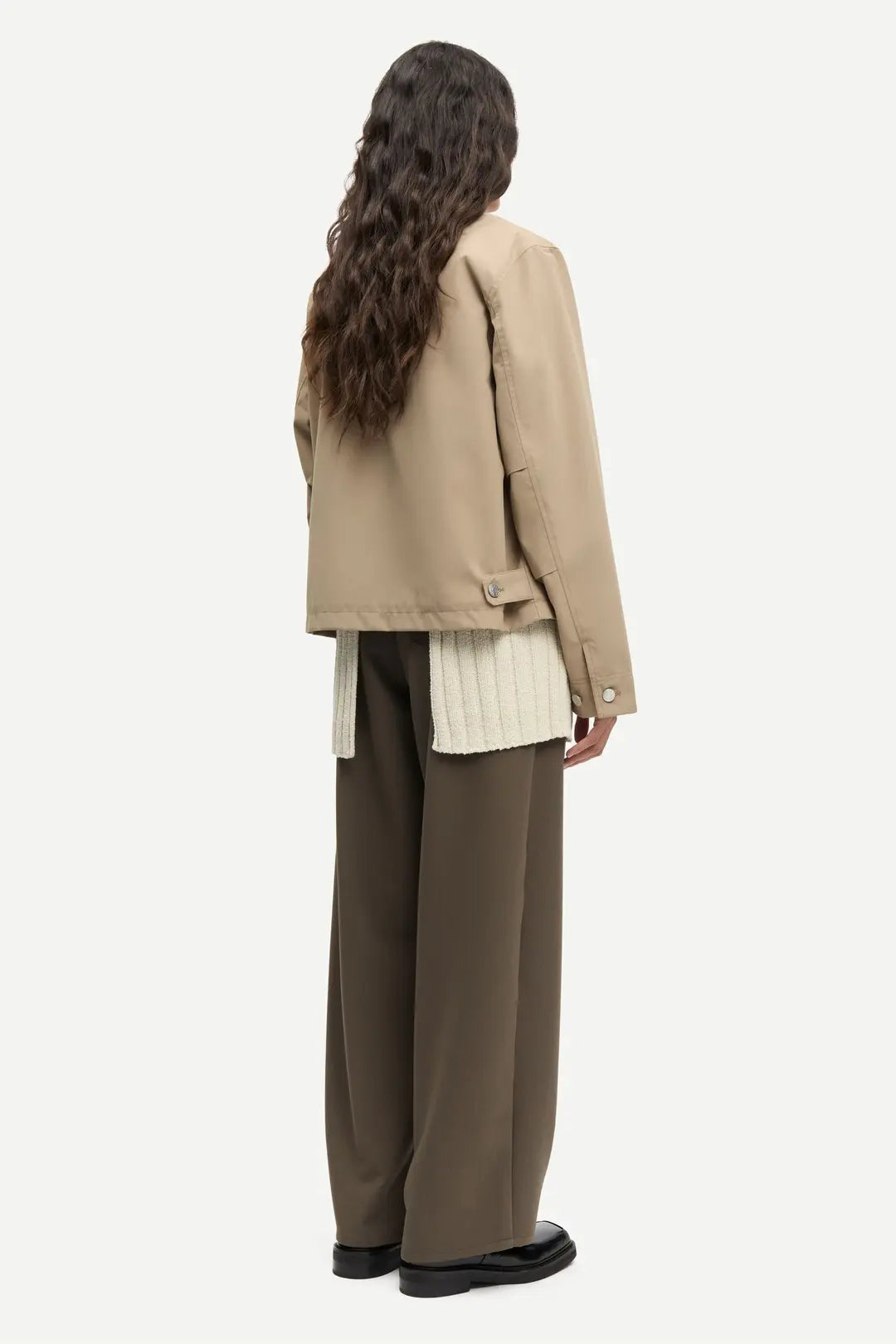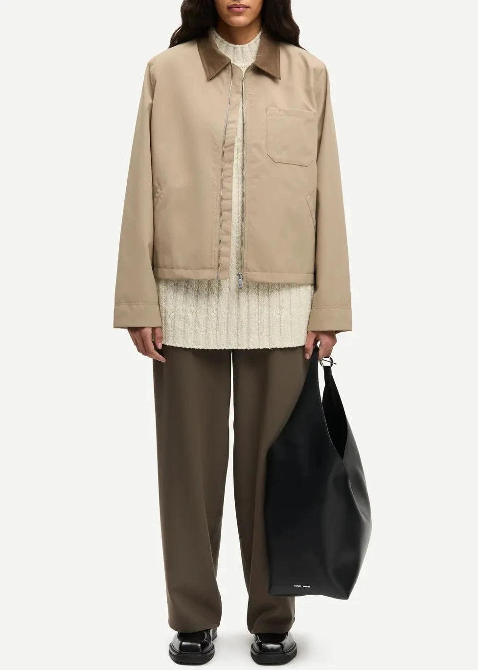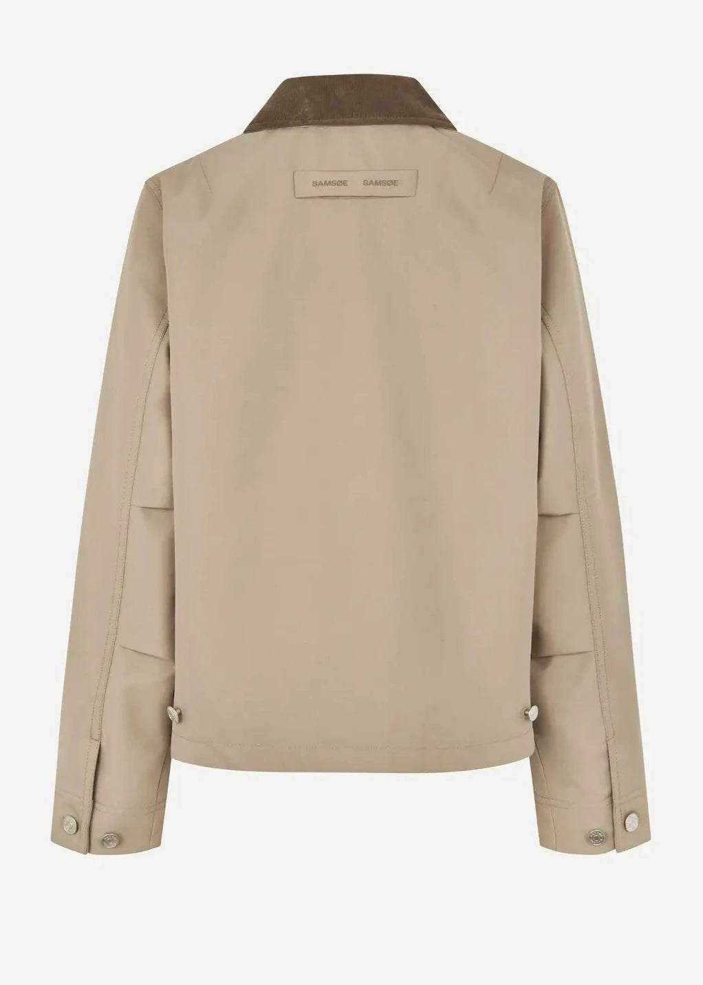 Jacket with a regular fit. Zipper closure on the front. Contrast cotton pointed collar, buttoned cuffs, and straight hem with adjustable side tabs. Patch pocket at the chest and slanted welt pockets on the front. Logo-branded patch at the back of the neck. Main lining made from 100% cotton. Main material made from 100% recycled polyester.