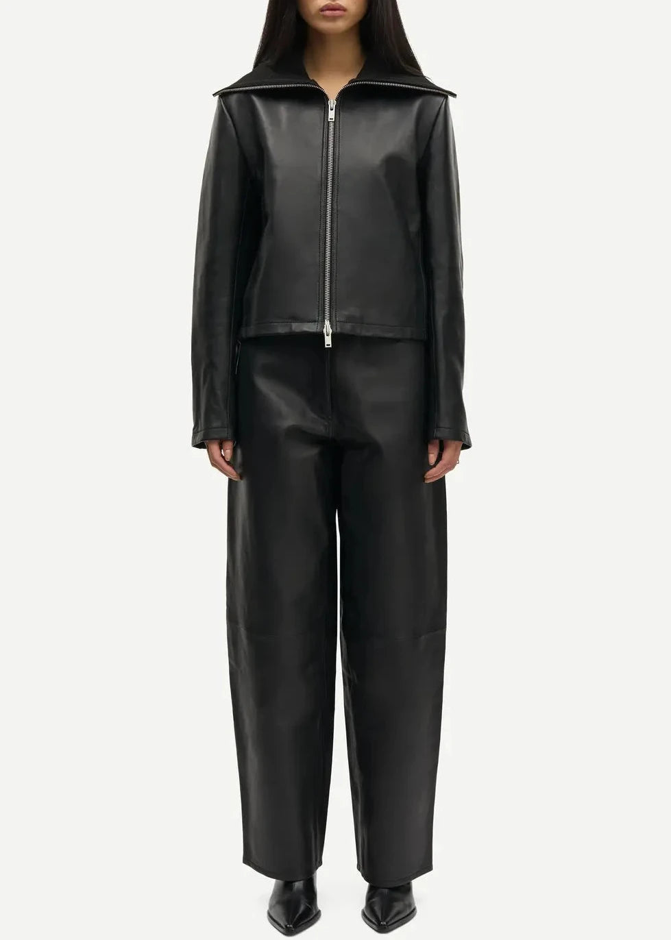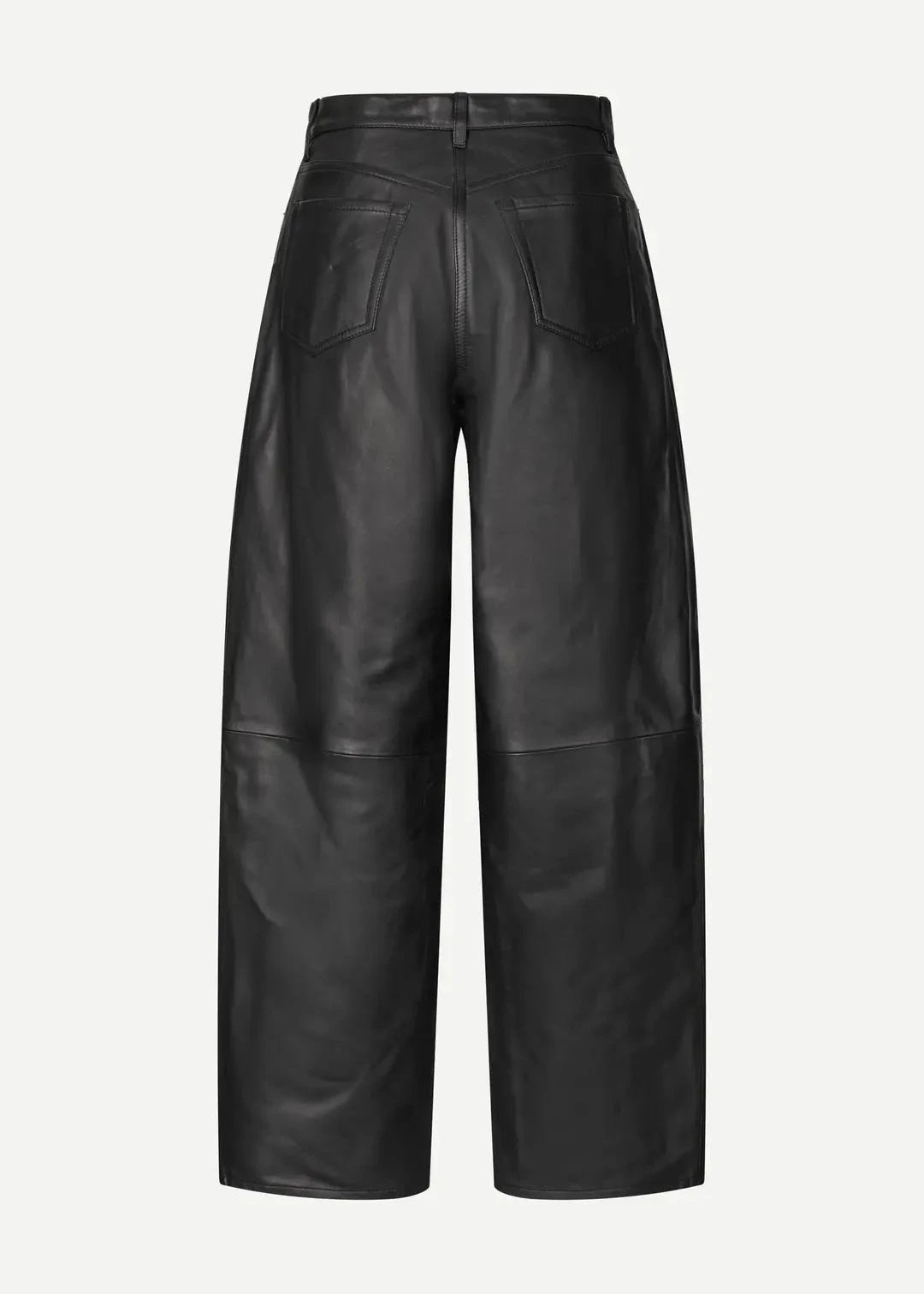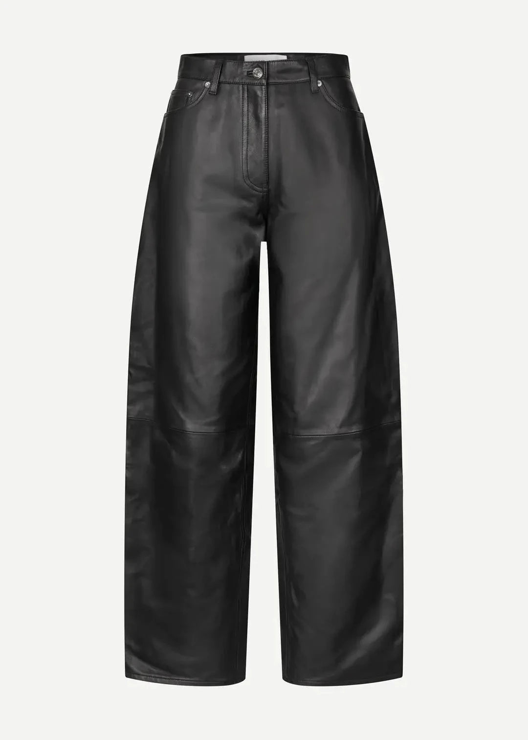 Mid-waist leather trousers with a loose fit and curved leg. Button and zipper closure on the front. Five pocket style. Partially lined. Main material made from 100% lamb leather. This product contains leather sourced from LWG-certified suppliers. LWG promotes responsible environmental practices across the leather supply chain.