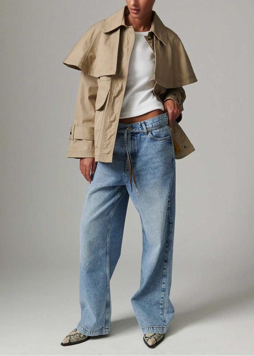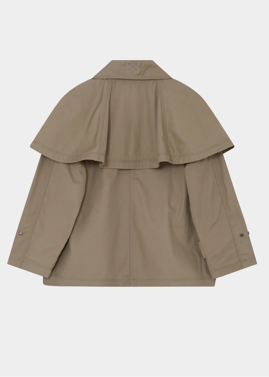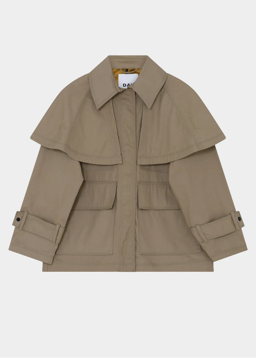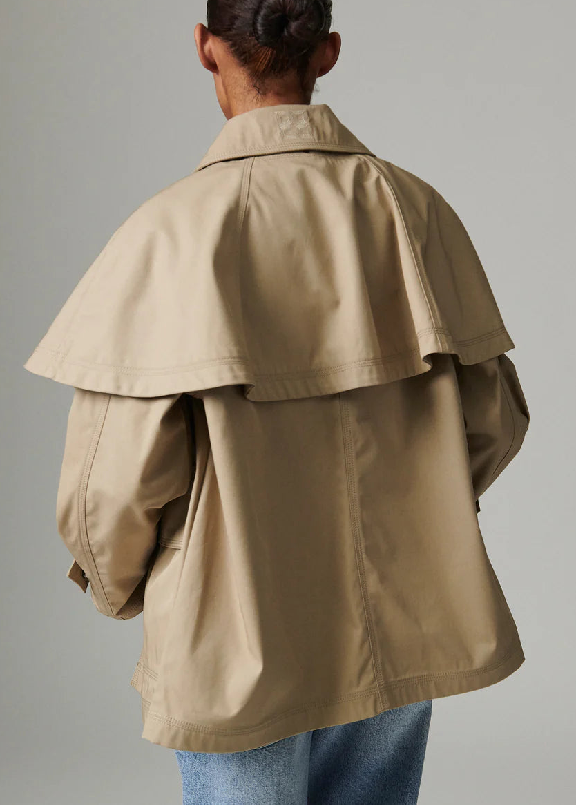 This chic trench-style jacket features a removable cape, snap button closures, and patch pockets. The jacket is fully lined. Pair it with dark-wash denim for a look that’s both cool and collected.