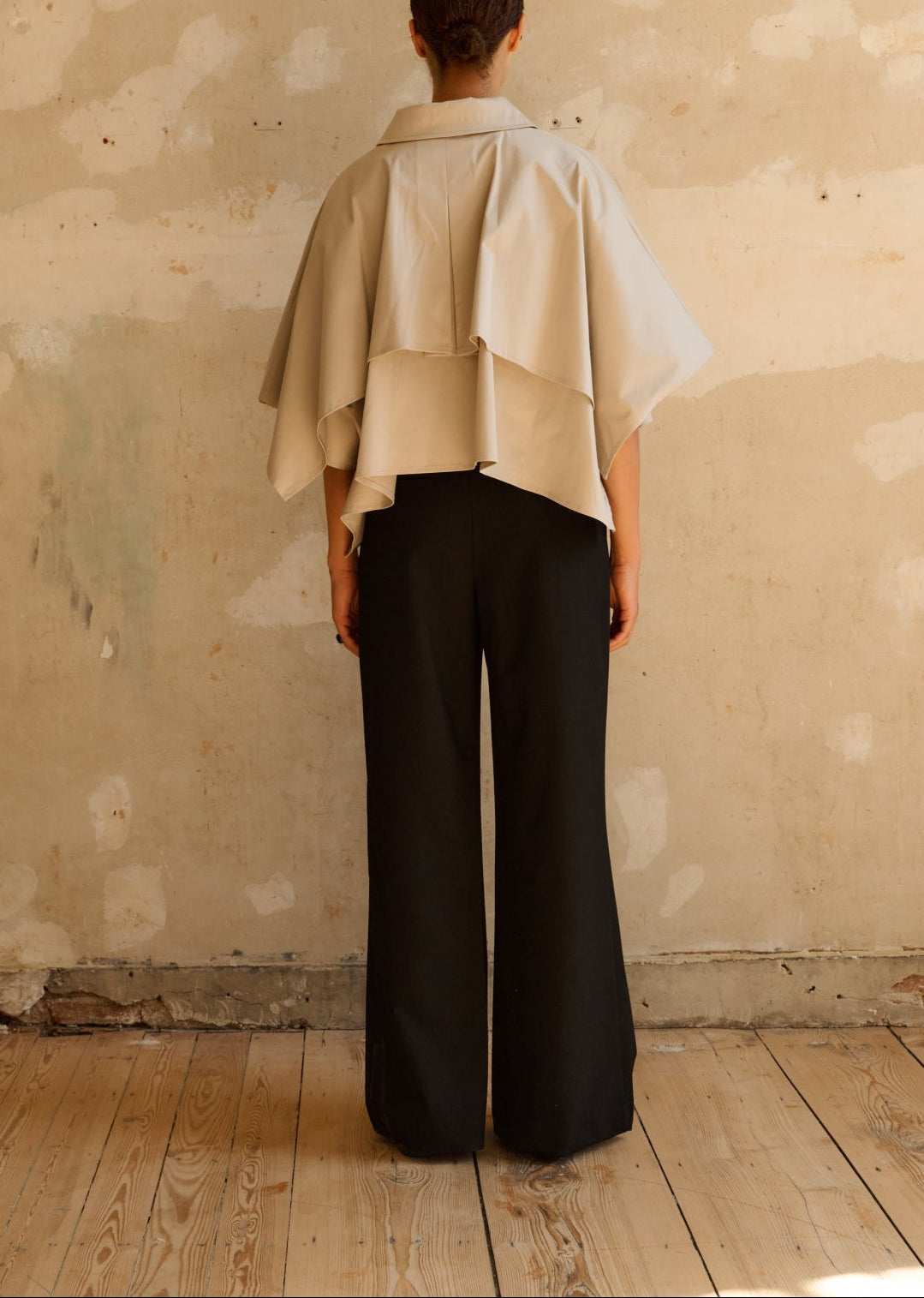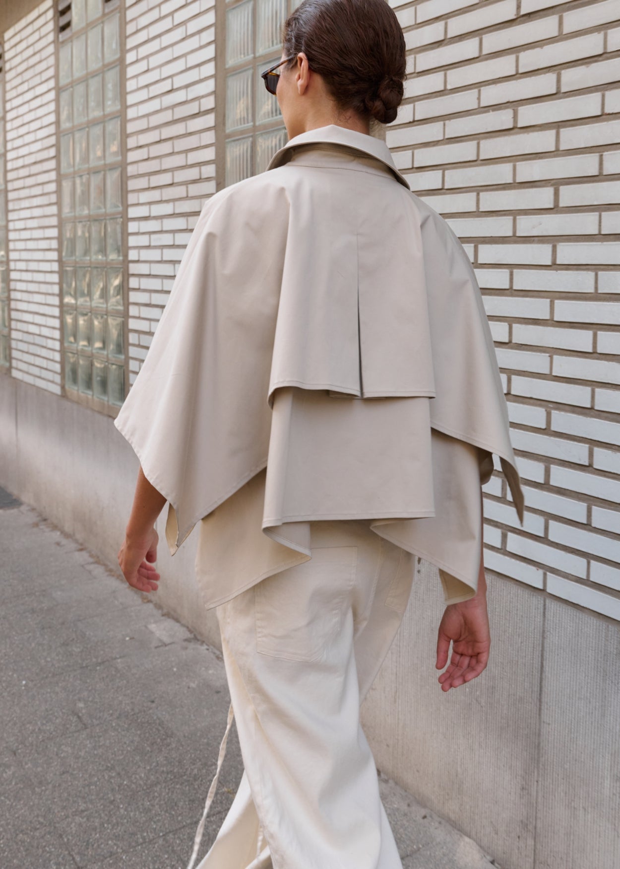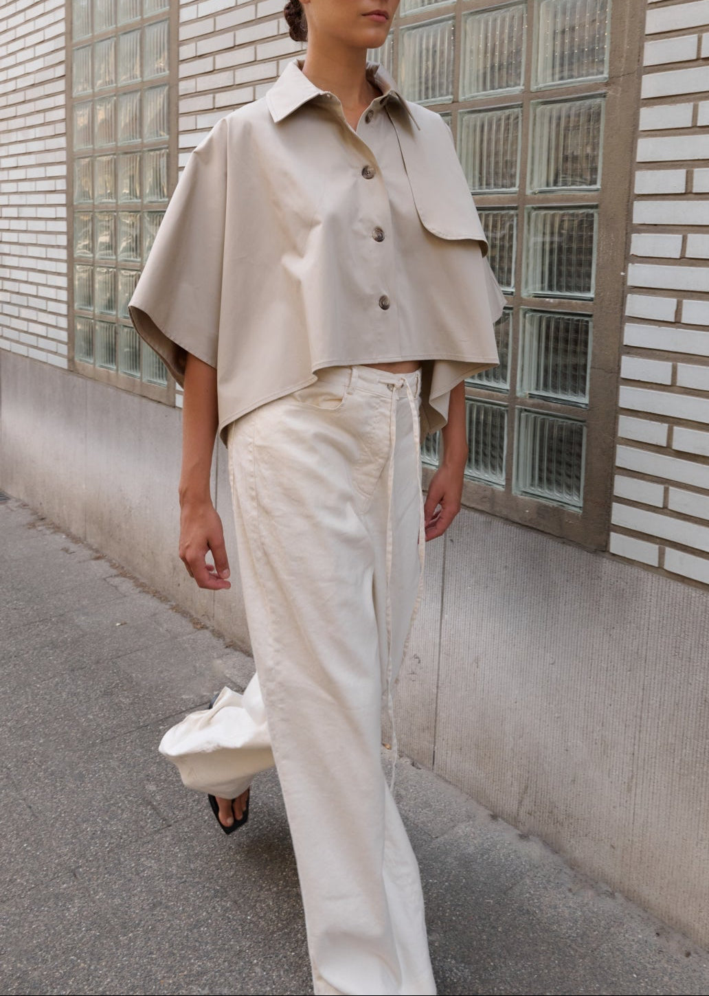 A beautifully designed cropped trench coat crafted from a soft cotton blend with a hint of stretch for comfort and structure. The wide sleeves add a modern, sculptural touch, giving this timeless silhouette a fresh and elevated feel.